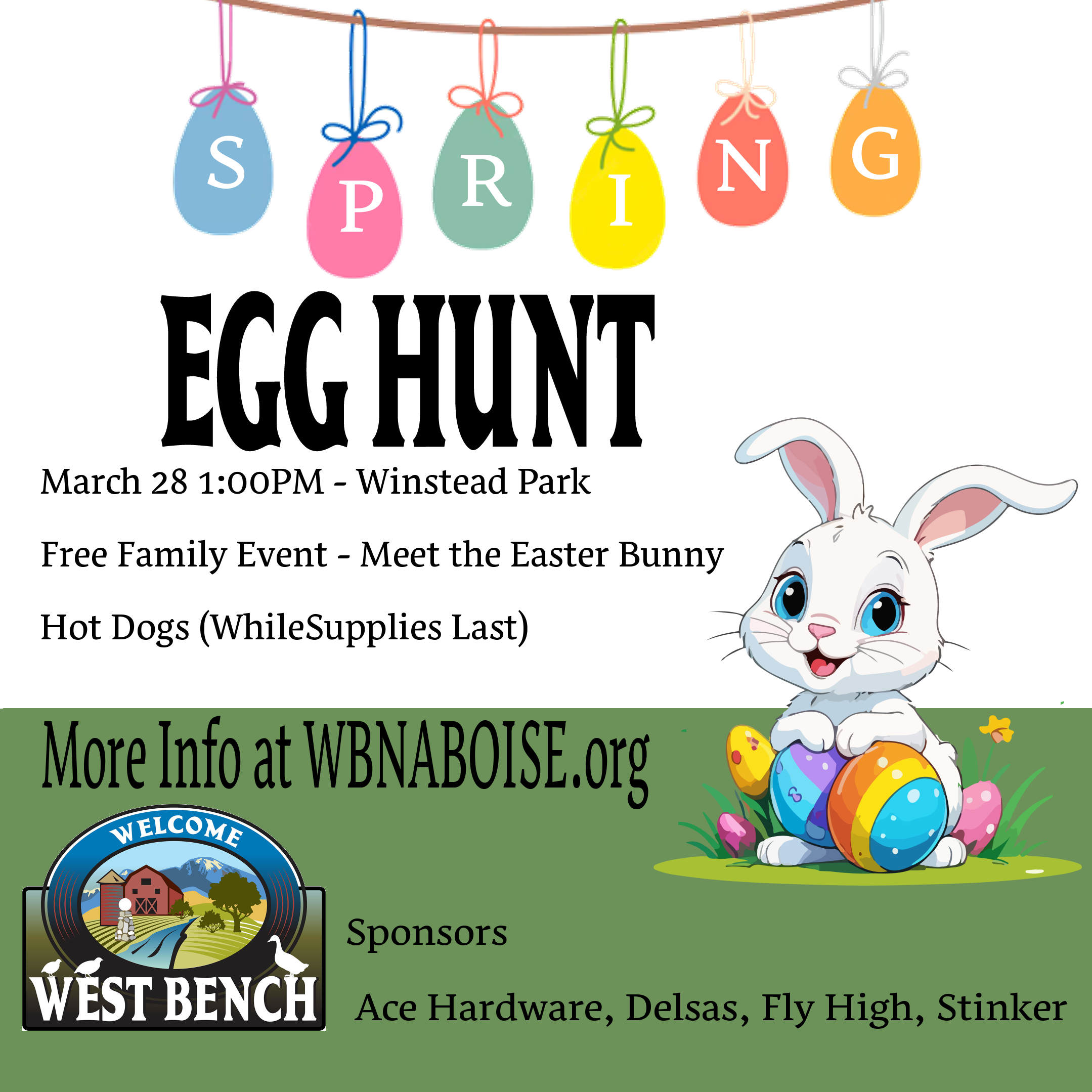West Bench Annual Spring Egg Hunt – Saturday, April 12th 11am at Winstead Park. Join West Bench Neighborhood Association for a free family-friendly egg hunt. Children ages 12 and under will search in aged-based groups for eggs that contain candy and other prizes! Keep an eye out for the Easter Bunny and stop for a photo opportunity. More info http://wbnaboise.org/